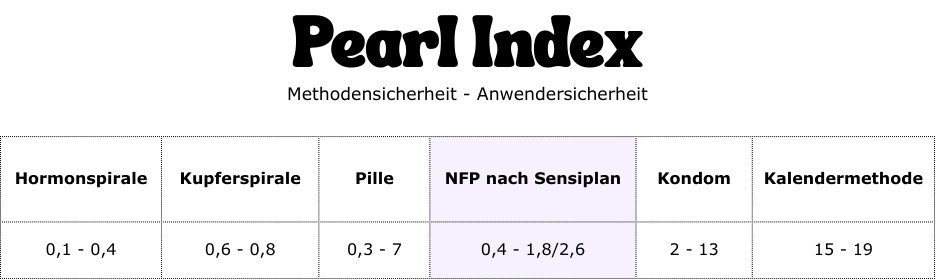 Die symptothermale Methode hat eine Methodensicherheit von 0,4 und eine Gebrauchssicherheit von 1,8 – 2,6 Schwangerschaften pro 100 Frauenjahre. (Frank-Herrmann et al., Universitätsfrauenklinik Heidelberg)
